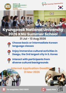 Kyungpook National University (KNU) is one of the ten Flagship Korean National Universities located in Daegu, the southeastern part of South Korea. The 2026 KNU Summer School is a 2-week programme featuring Korean language classes and unique cultural experiences. Participants can practise Korean, participate in cultural activities, and interact with participants from diverse cultural backgrounds.