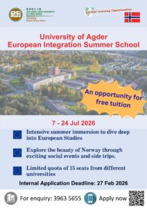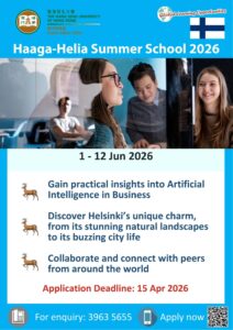 UG students who take a 4-week session with at least 2 ten-session courses can apply for the above scholarship. For details, please check the announcement from SAO (HERE). Application deadline for the scholarship is 22 Feb 2026. - Scheme for Subsidy on Exchange for Post-secondary Students (SSE)