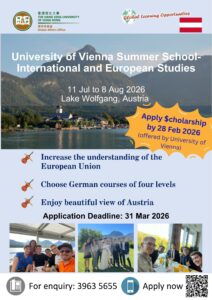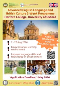 UG students who complete the 3-week session and obtain a Final Grade Transcript and Certificate can apply for the above scholarship. For details, please check the announcement from SAO (HERE). Application deadline for the scholarship is 22 Feb 2026. - Scheme for Subsidy on Exchange for Post-secondary Students (SSE)