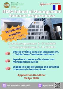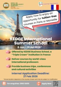 KEDGE offers “tuition-free” quotas for 2 HSUHK students. The 2 selected students are required to attend 2 courses. HSUHK may invite applicants for an interview.