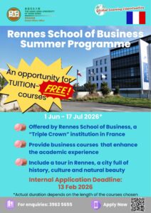 Rennes School of Business offers “tuition-free” quotas for 3 HSUHK students to attend 1 course. HSUHK may invite applicants for an interview.