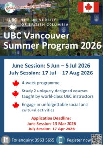 UG students who take at least 3-week session with completing at least 1 course with 4 credits can apply for the above scholarship. For details, please check the announcement from SAO (HERE). Application deadline for the scholarship is 22 Feb 2026. - Scheme for Subsidy on Exchange for Post-secondary Students (SSE)